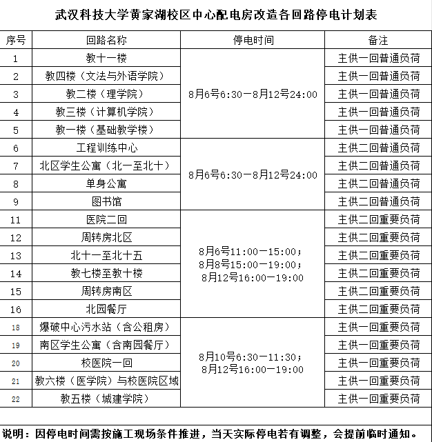 永利官网黄家湖校区中心配电房配电柜设备已投入使用近20年,已超设备使用年限。自去年以来故障频发,严重影响学校正常的教学和科研秩序,同时也给广大师生生活带来诸多不便。为确保供电安全,学校拟于暑期对黄家湖中心配电房进行设备更换升级,现根据校园用电实际情况,将近期各区域停电时间通知如下:
