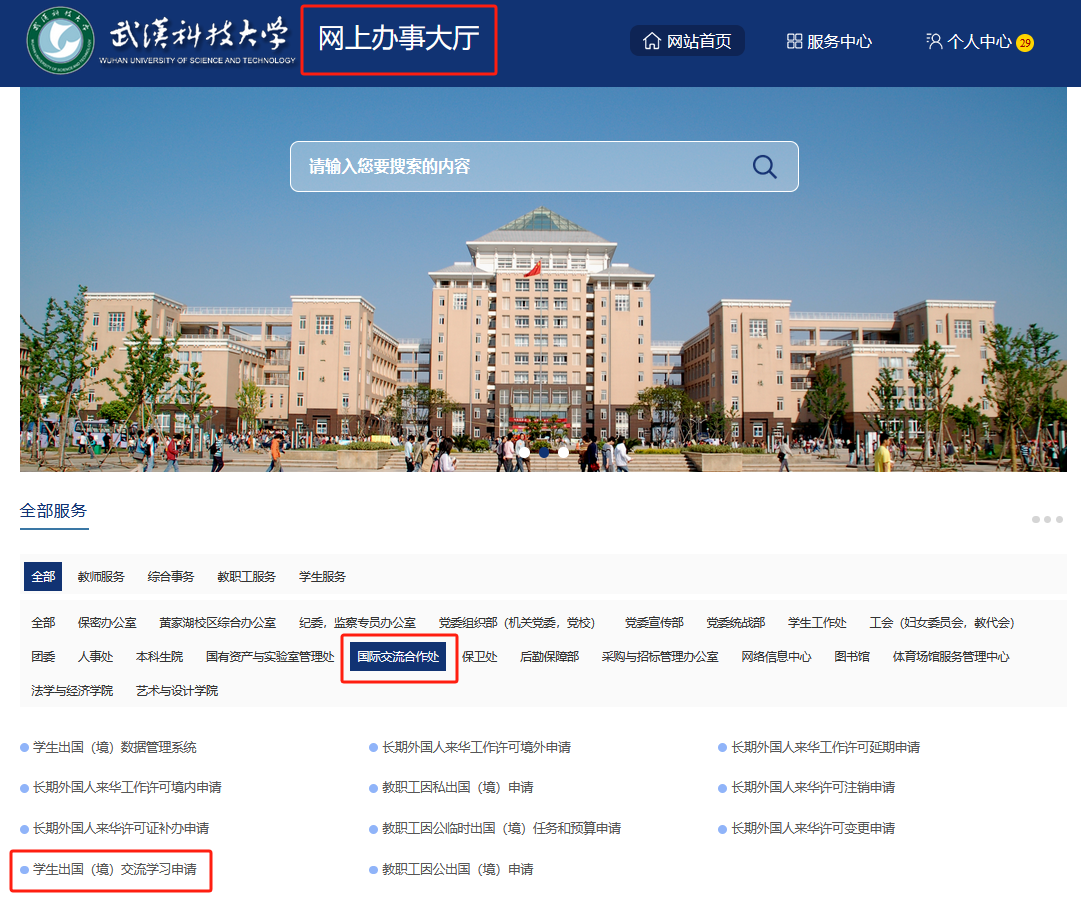 1、进入学校官网主页“办事大厅”