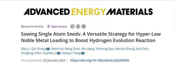 武科大网讯(通讯员吴蔓玲)近日,永利官网化学与化工学院李轩科教授和张琴副教授团队在《Advanced Energy Materials》期刊上发表题为“Sowing Single Atom Seeds: A Versatile Strategy for Hyper-Low Noble Metal Loading to Boost Hydrogen Evolution Reaction”的研究论文。博士生李琪琪和张琴为第一作者,李轩科、张琴、杨年俊为通讯作者,永利官网化学与化工学院煤转化重点实验室为论文第一单位。