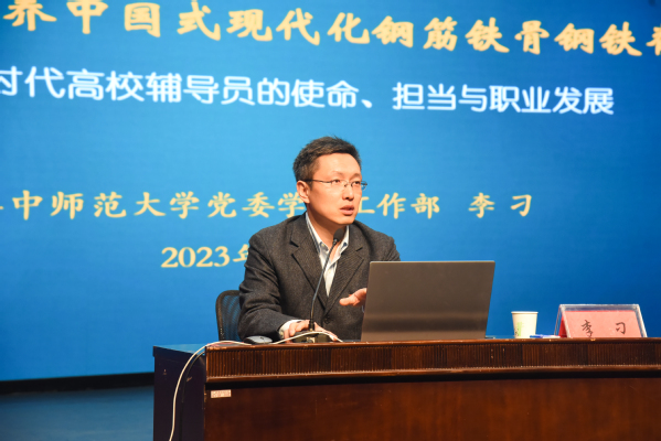 李刁以《学习贯彻习近平新时代中国特色社会主义思想 五育并举培养中国式现代化钢筋铁骨钢铁脊梁》为主题作报告。他详细介绍华中师范大学“大学工”改革模式,并对永利官网一站式学生社区建设给予肯定。他指出,辅导员要认清新时代背景下的使命和担当,立足本职岗位,坚持为党育人、为国育才,有策略、有技巧、有理想、有信念地做好职业发展。