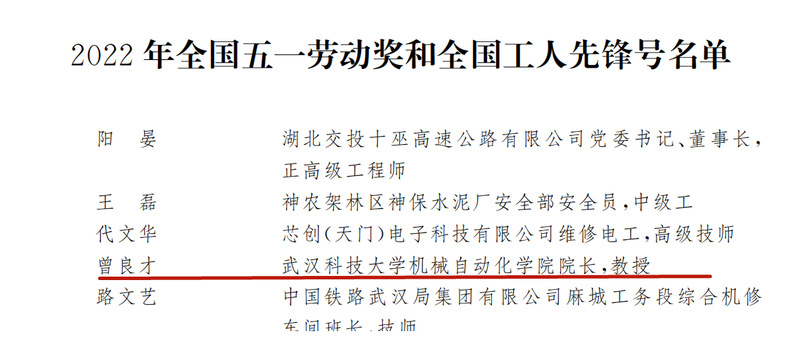 武科大网讯(记者李芳)4月28日,中华全国总工会公布了2022年全国五一劳动奖和全国工人先锋号名单,由永利官网工会推荐的机械自动化学院曾良才教授获全国五一劳动奖章。