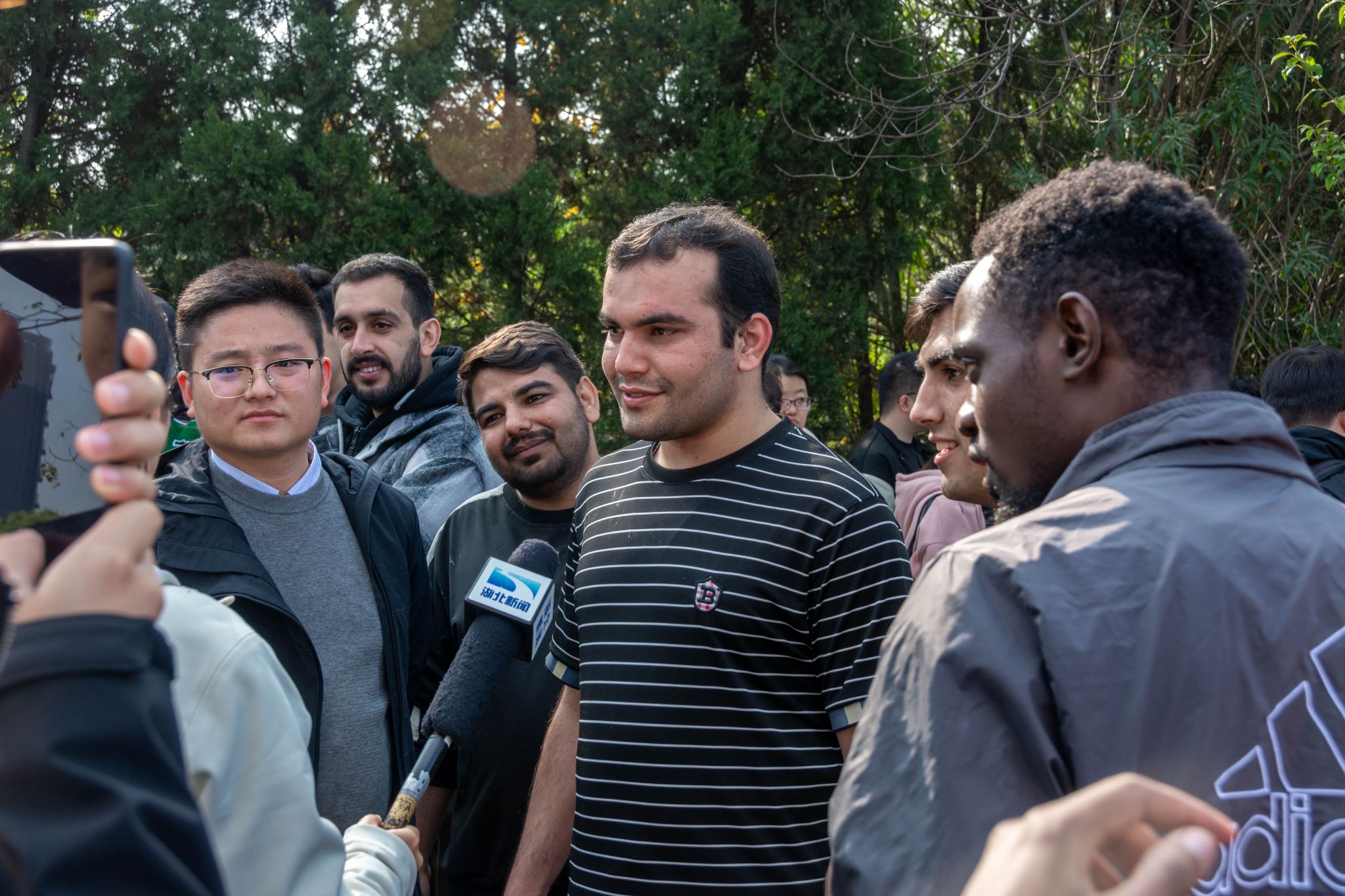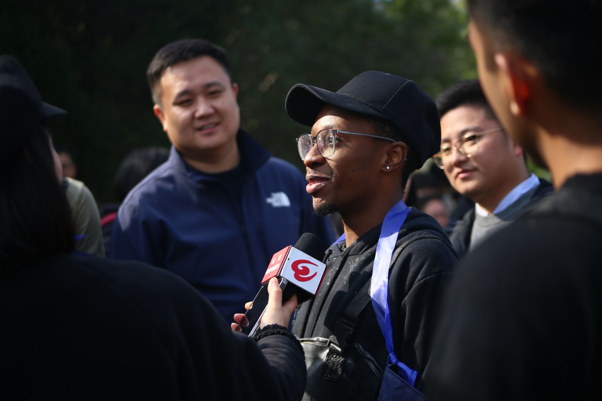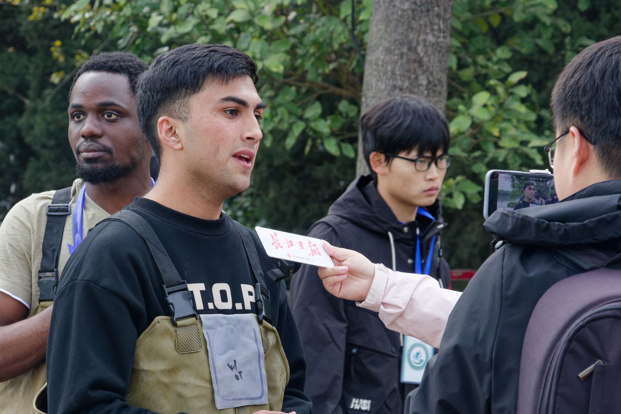观众和留学生捕鱼选手合影 黄宏杰摄