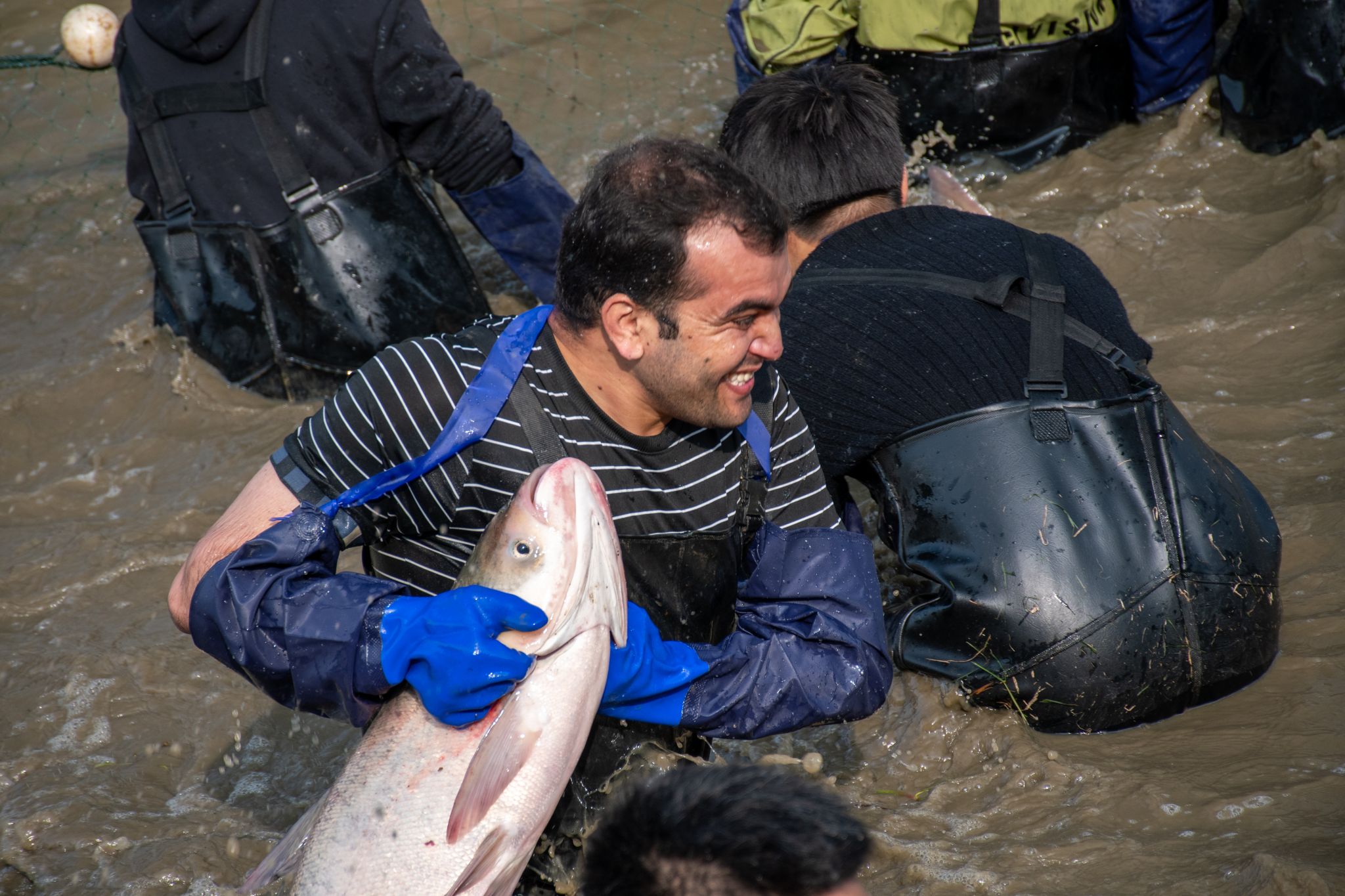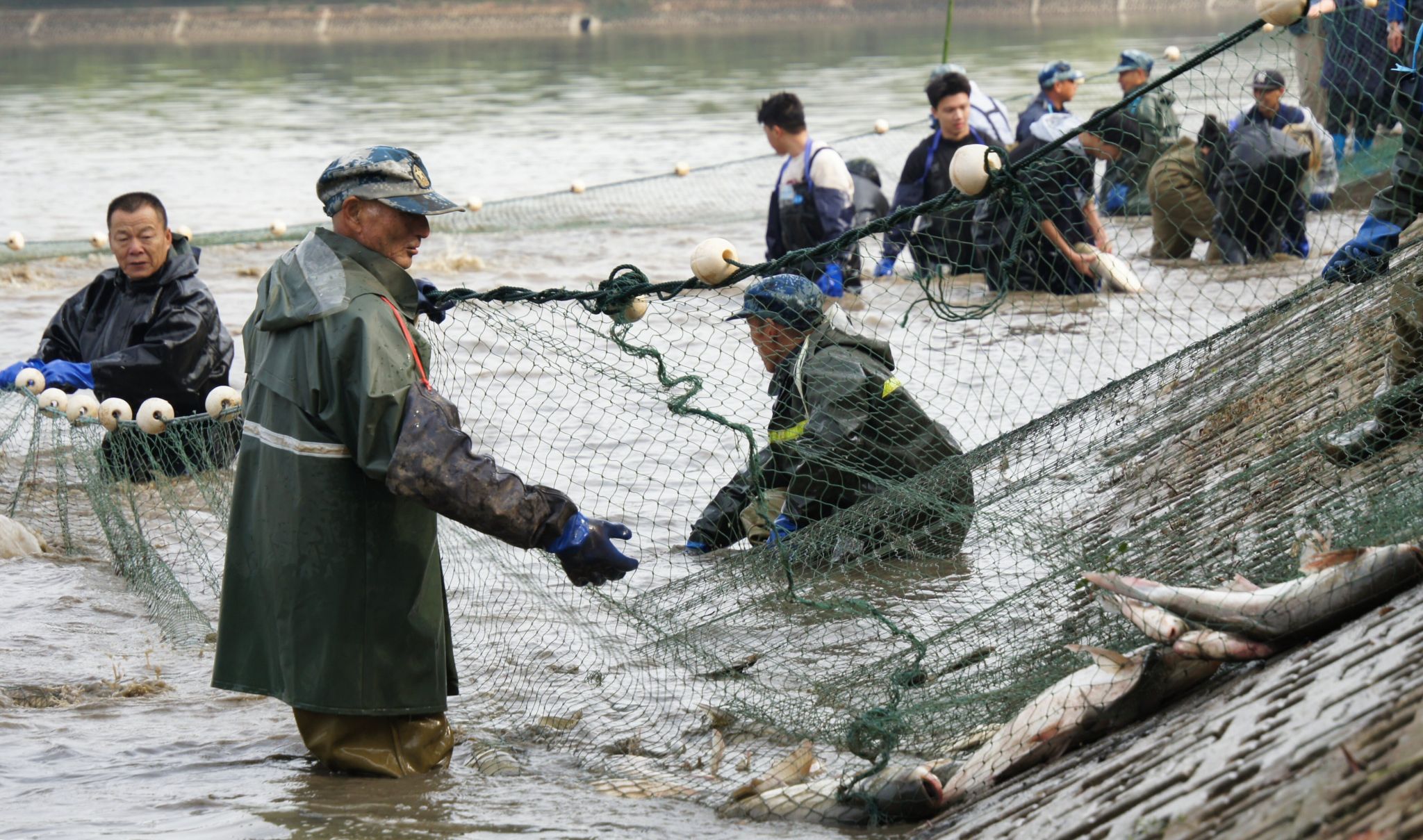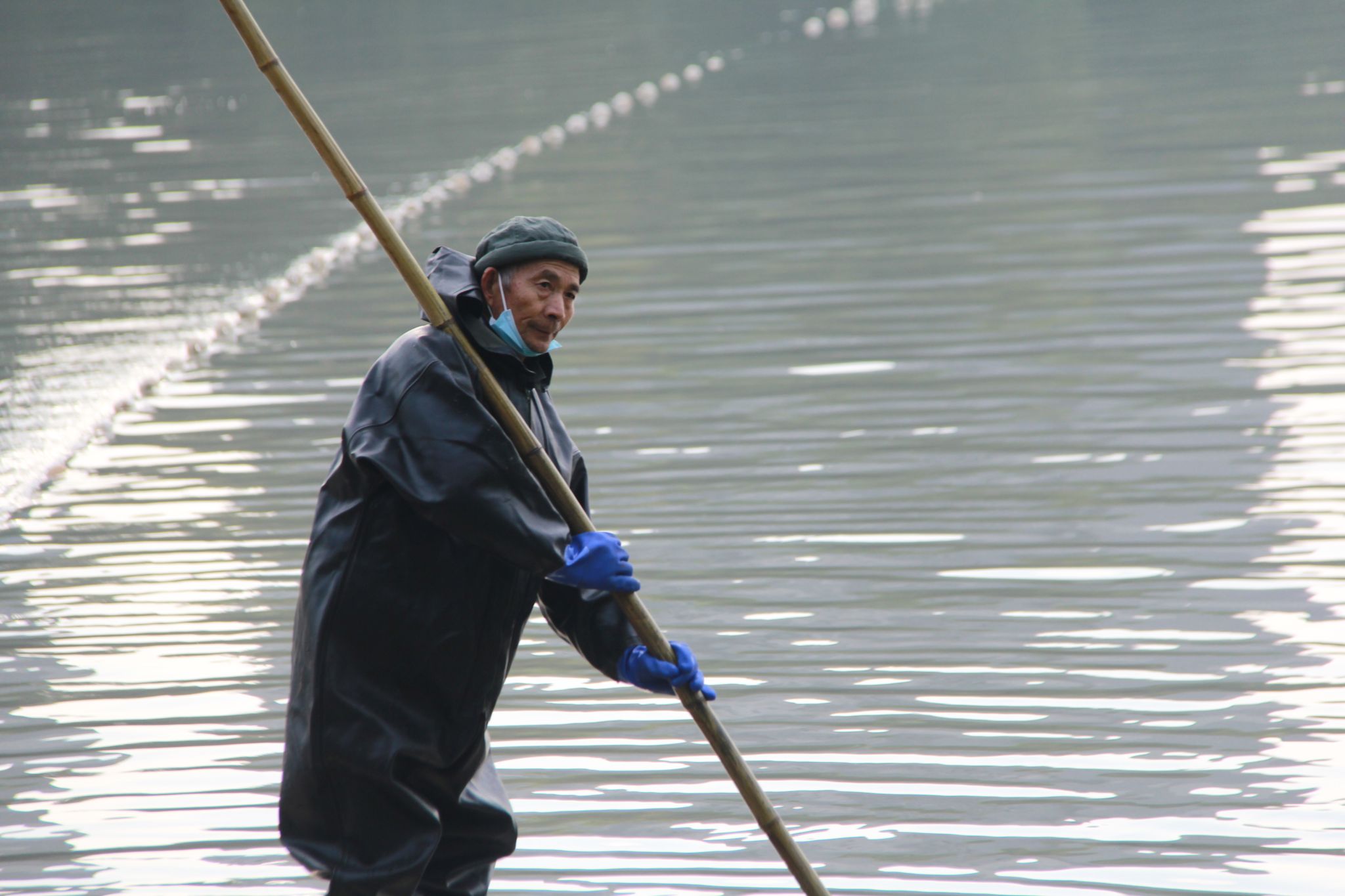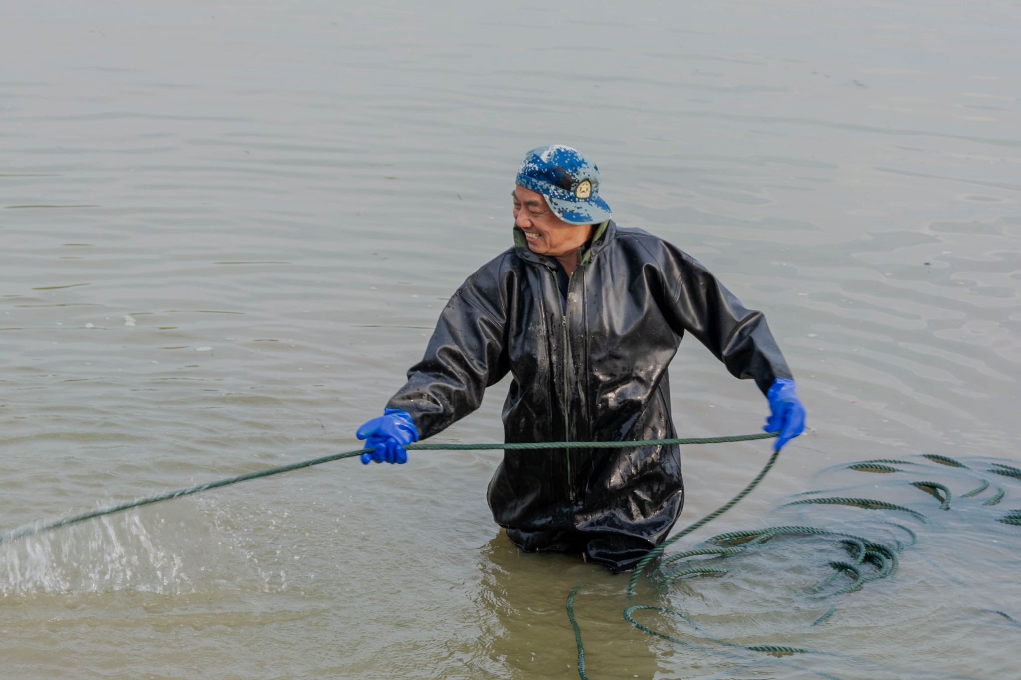 拉鱼后勤爷爷与跃出的鱼特写 陈楷林摄