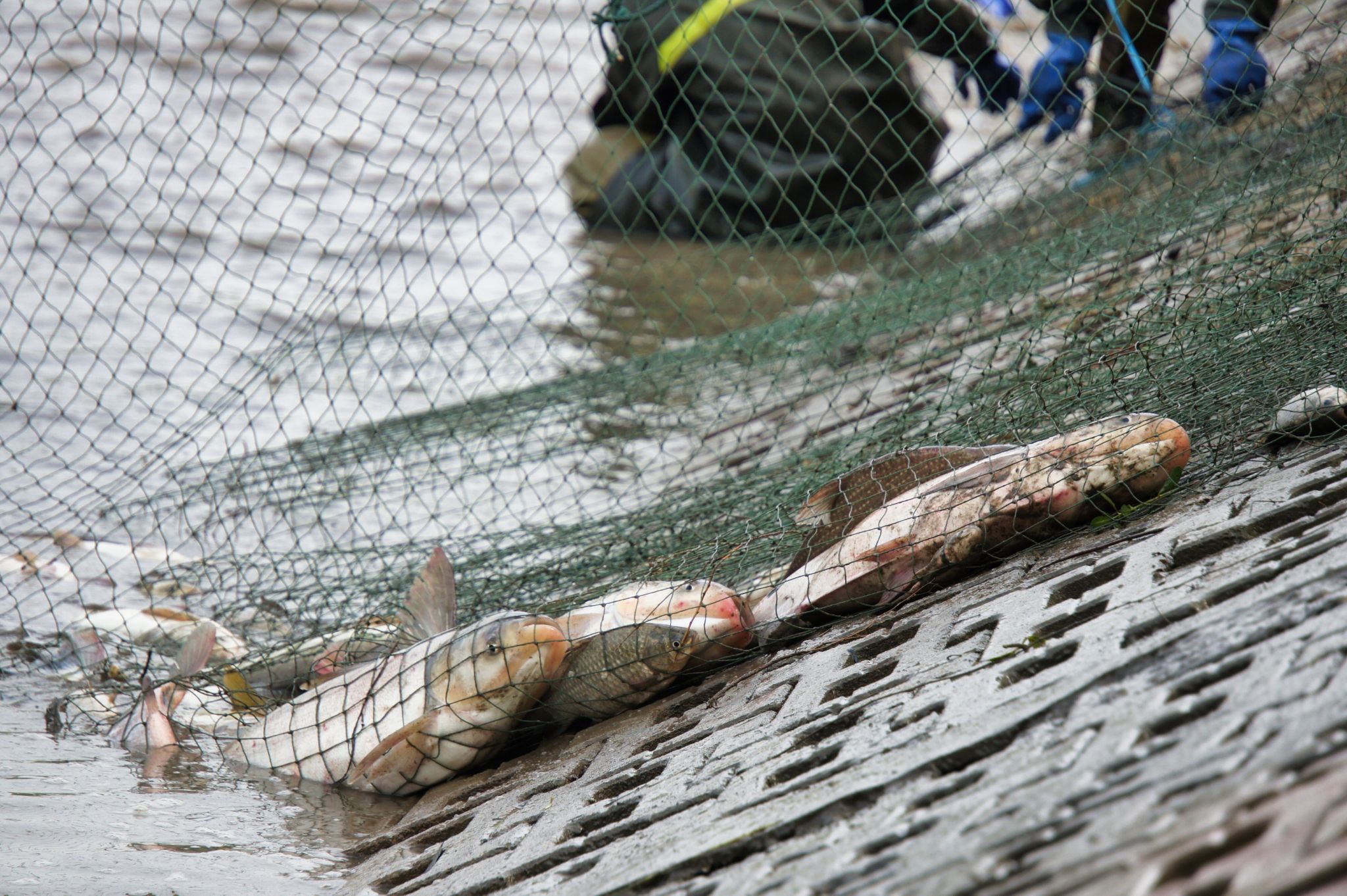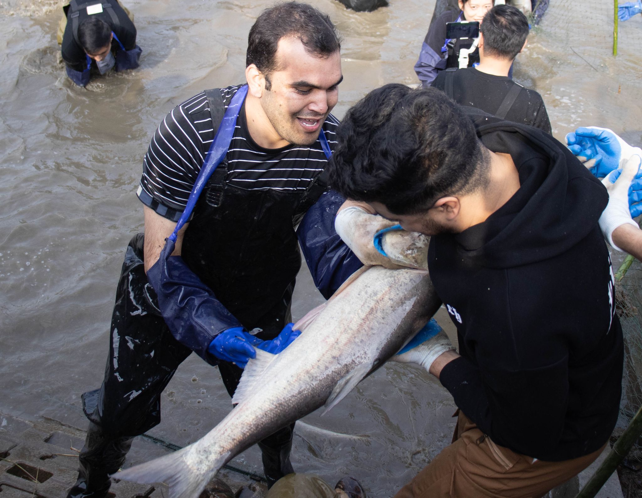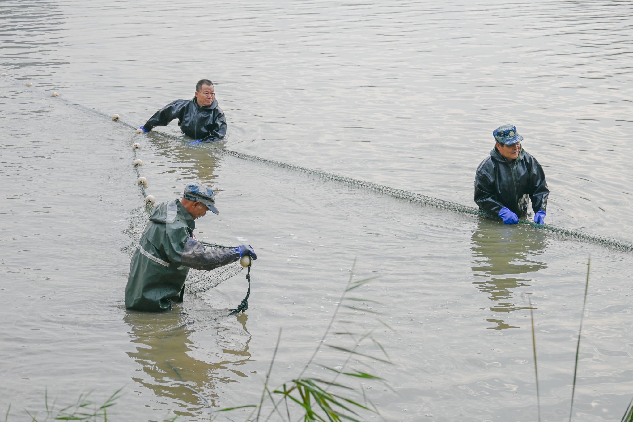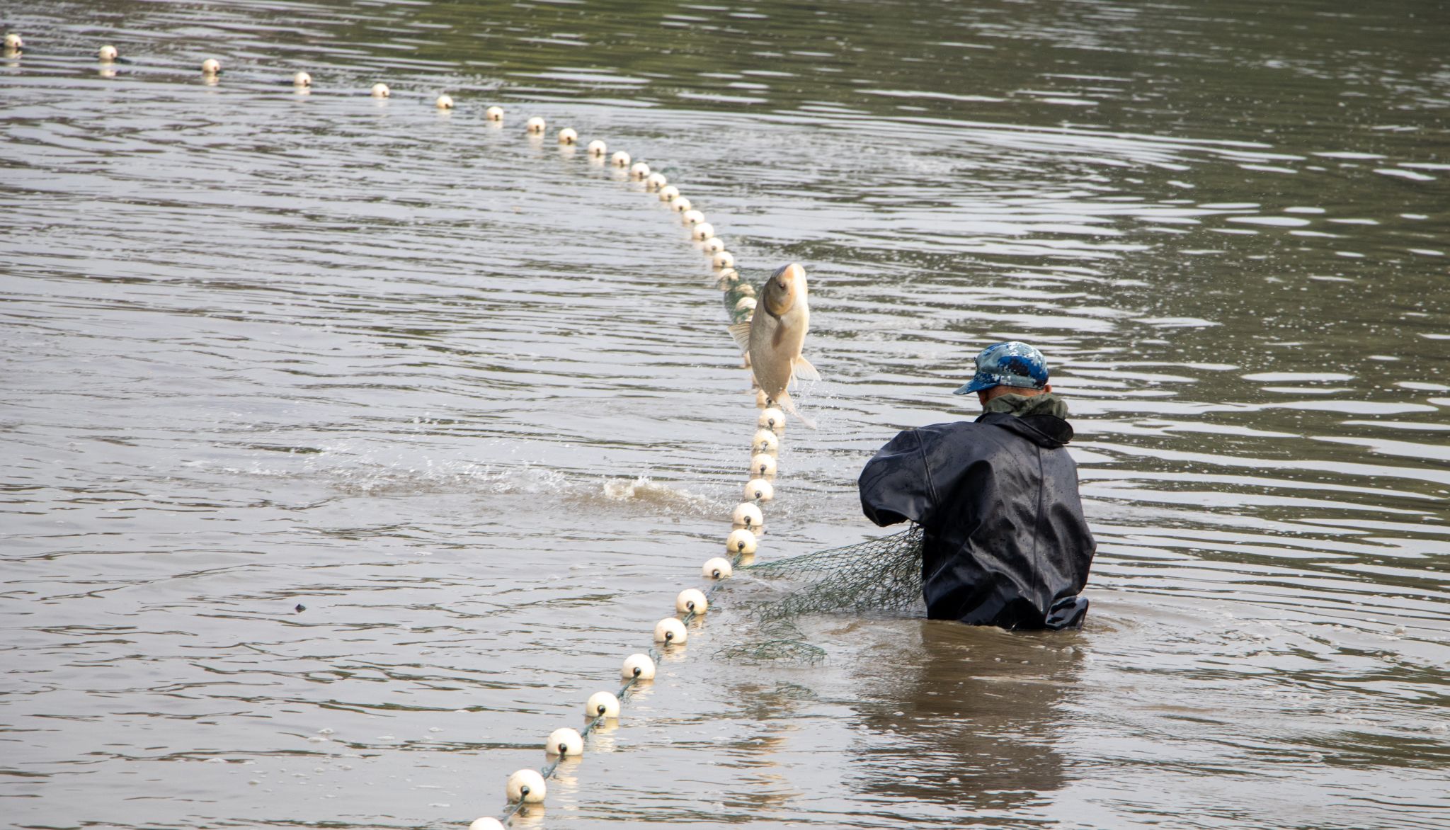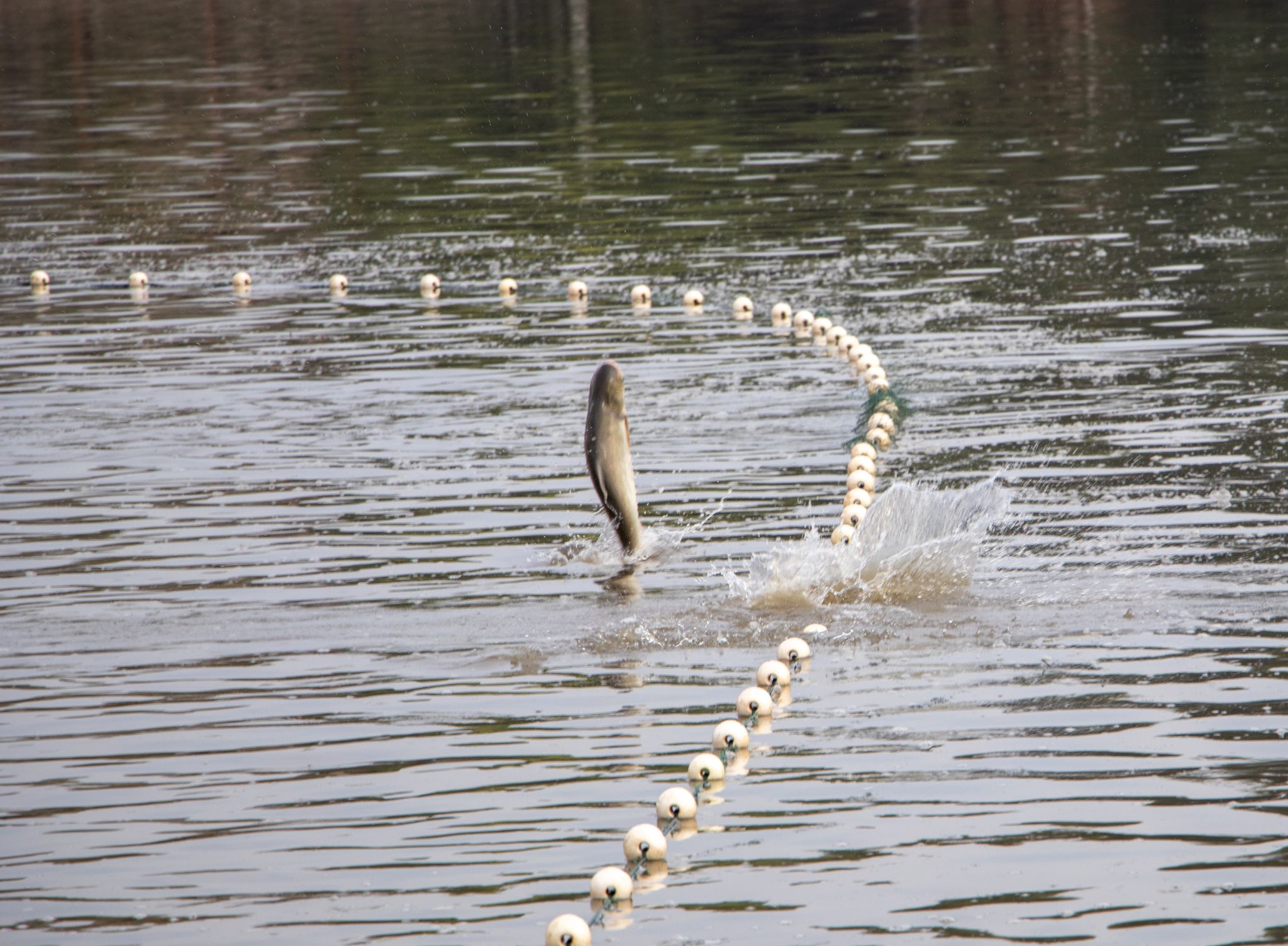 拉鱼后勤爷爷与跃出的鱼特写 陈楷林摄