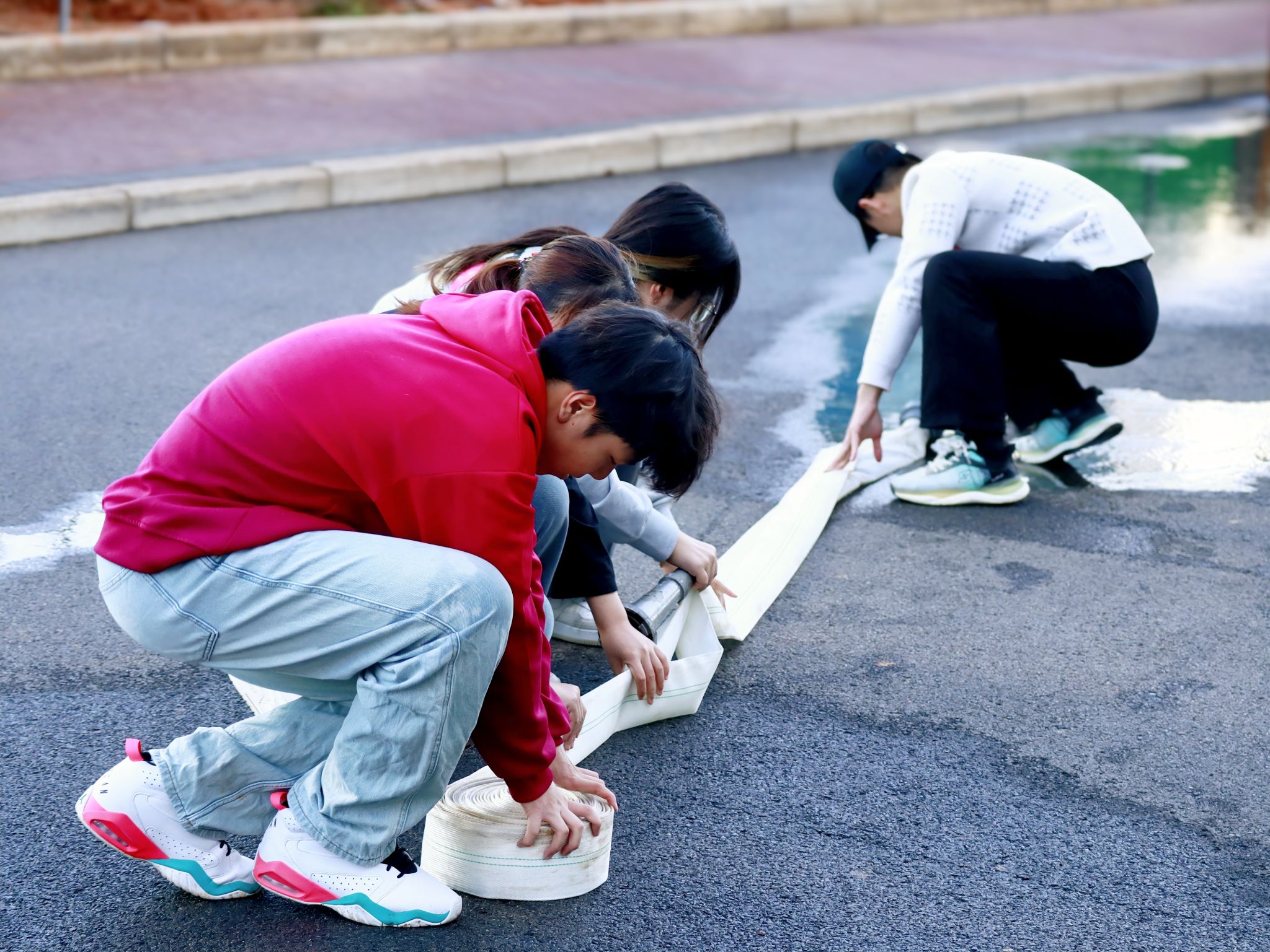 参赛选手合力回收消防水带 王铭浩摄