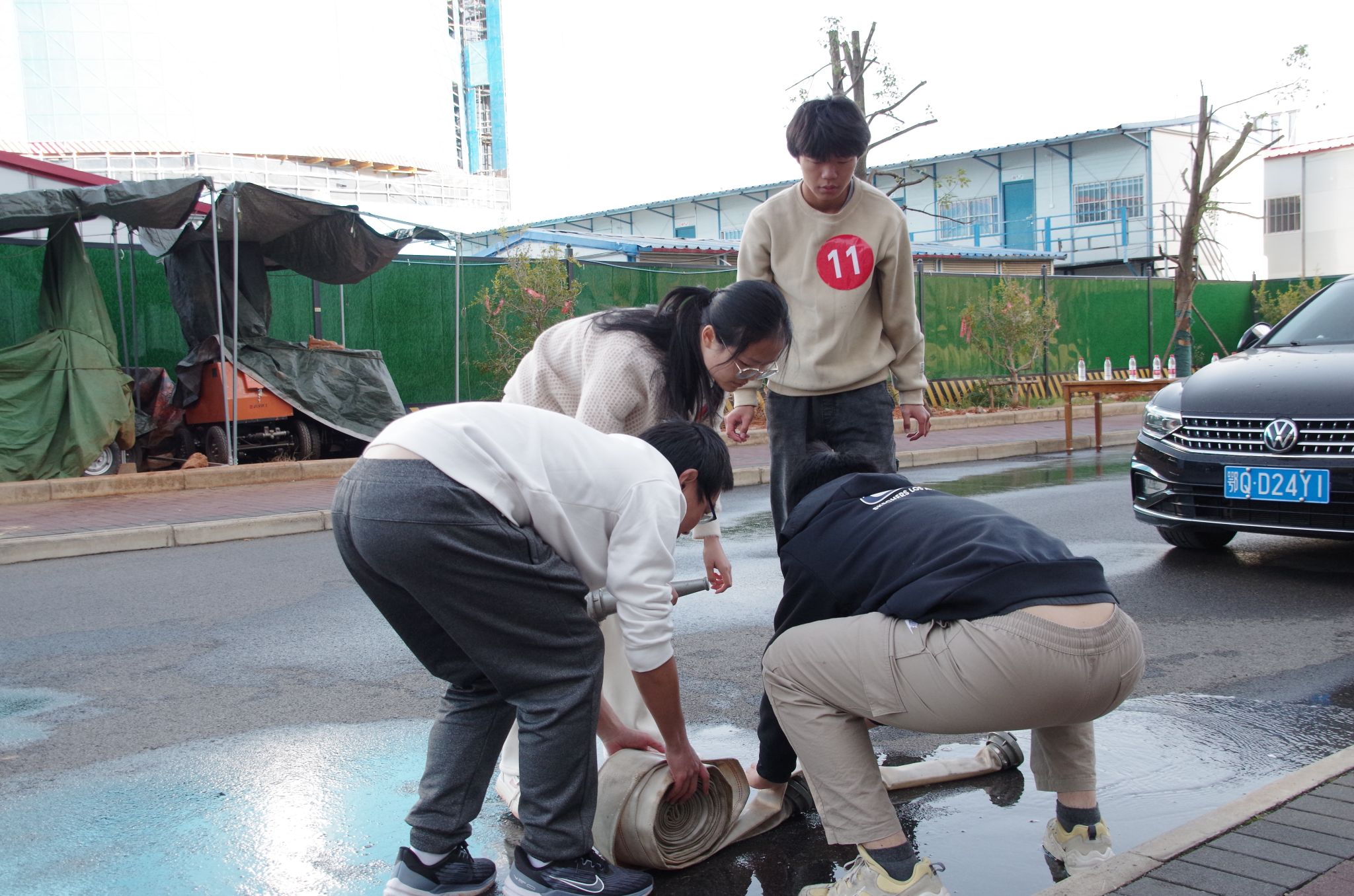 参赛选手共同回收水带 王铭浩摄