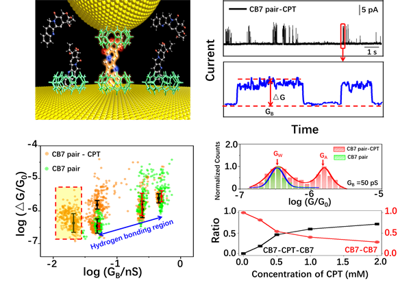 研究团队以葫芦[7]脲超分子为纳米反应器,运用识别隧道电流技术研究了限域空腔中药物分子喜树碱的结构转变,实现了动态可逆过程的精准表征,为众多无锚基分子在不同化学环境下的结构动态监测提供了新方法。论文“Dynamic Interconversions of Single Molecules Probed by Recognition Tunneling at Cucurbit[7]uril-Functionalized Supramolecular Junctions”在线发表于国际顶尖期刊Angewandte Chemie International Edition,并被评为热点文章(https://doi.org/10.1002/anie.202203830)。材料与冶金学院博士生肖博怀为该论文的共同第一作者,常帅教授、德国不来梅雅各布大学Werner M. Nau教授和永利官网化学与化工学院刘思敏教授为该论文共同通讯作者,永利官网为成果第一完成单位。