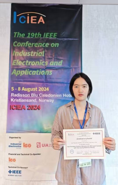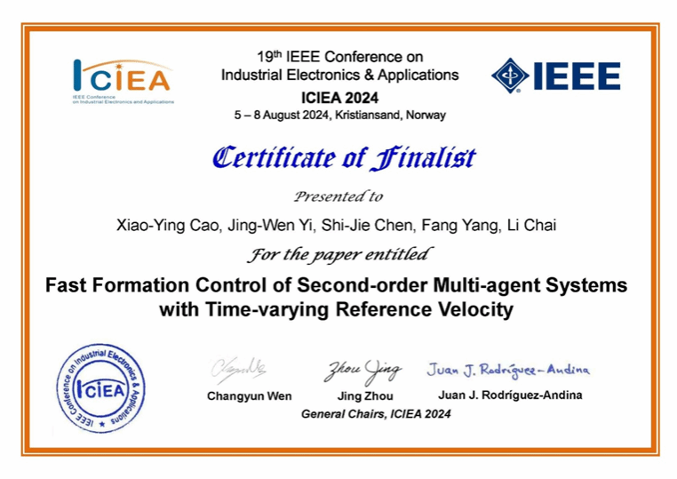 武科大网讯 8月5日至8日,第19届IEEE工业电子与应用国际会议(19th IEEE Conference on Industrial Electronics and Applications, ICIEA 2024)在挪威克里斯蒂安桑召开。永利官网人工智能与信息融合研究院易静文副教授课题组硕士研究生曹晓颖的论文“Fast Formation Control of Second-order Multi-agent Systems with Time-varying Reference Velocity”荣获ICIEA 2024最佳论文入围奖。
