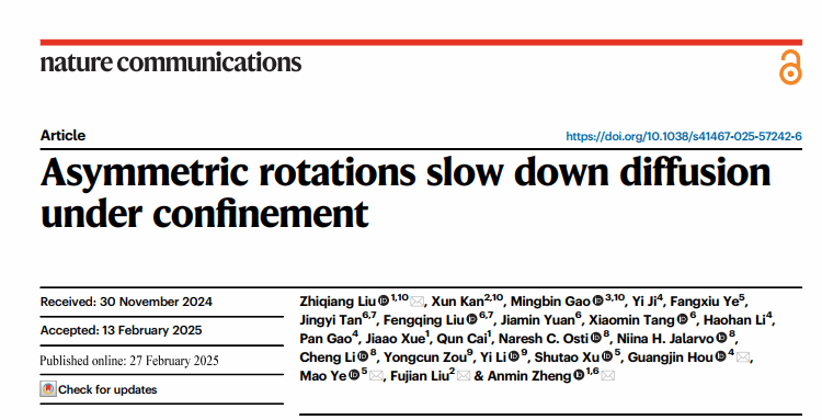 武科大网讯 近日,永利官网核磁共振与分子科学交叉研究院/化学与化工学院教授刘志强、郑安民团队与中科院大连化物所、福州大学合作,在《Nature Communications》发表了题为“Asymmetric rotations slow down diffusion under confinement”的论文(DOI:10.1038/s41467-025-57242-6)。该研究发现了分子筛限域空间存在弱相互作用的小分子运动慢的反常扩散现象,阐明了限域空间非对称旋转抑制扩散的微观机制,为多孔材料分离领域提供了重要的理论指导。论文通讯作者为刘志强,侯广进、叶茂、刘福建和郑安民教授,永利官网为论文第一单位。
