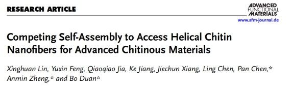 武科大网讯 近日,永利官网核磁共振与分子科学交叉研究院/化学与化工学院教授段博、郑安民团队与北京理工大学合作展开研究,在《Advanced Functional Materials》发表了题为“Competing Self-Assembly to Access Helical Chitin Nanofibers for Advanced Chitinous Materials”的重要研究成果(DOI: 10.1002/adfm.202503547)。该研究创新性提出“竞争自组装”策略,首次通过精准调控甲壳素分子链的化学特性,成功制备出具有螺旋结构的再生甲壳素纳米纤维。这一成果不仅攻克了结晶性高分子纳米尺度可控组装的难题,更为开发高性能环保材料、3D生物打印等前沿应用提供了全新解决方案。论文通讯作者为段博、郑安民和陈攀教授,永利官网为论文第一完成单位。