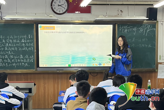 实习后两周,研支团成员走进课堂进行试讲。研支团成员曹传颖率先在八年级数学组开展了教学示范课。学生周思博说:“曹老师循循善诱,适当点拨,让我学到了新的解题思路特别开心。”