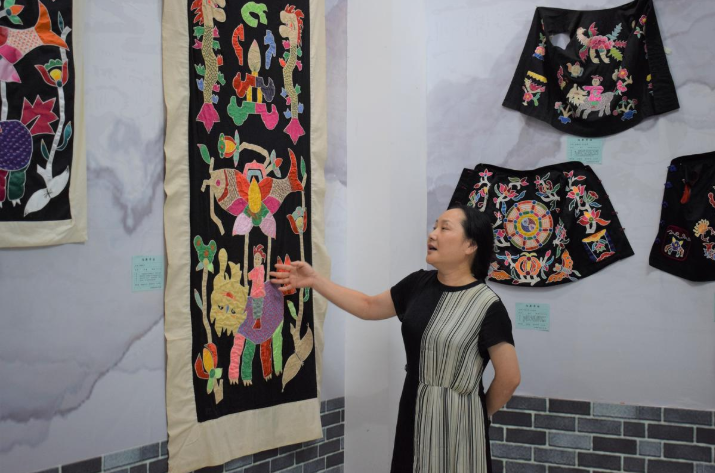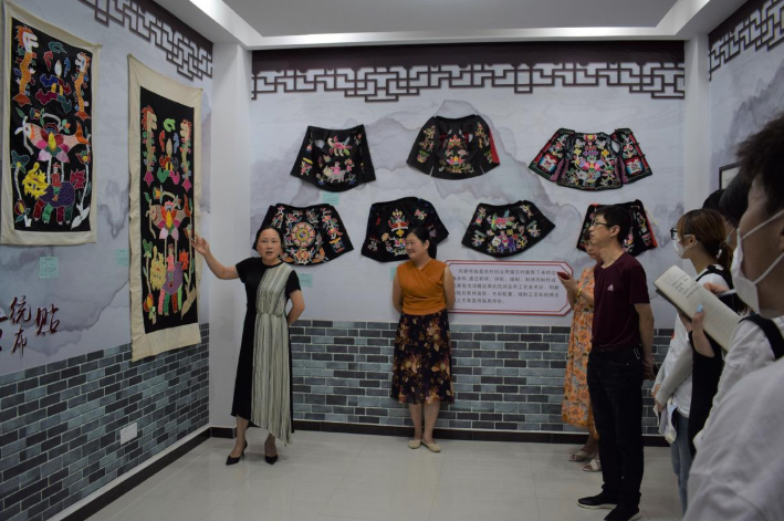 胡芳带领团队来到文化馆二楼非遗文化展示厅。麒麟送子、龙凤呈祥、鸳鸯戏水等各式各样图案陈列其中,在这数十米长的展厅,展示了包括马甲、披肩、蒲团等在内的数百件贴近古代人民生活的物品。胡芳介绍,除了传统的图案装饰,阳新布贴还结合了当今时代热点时事,创造出“筑梦同心圆”、“天佑中华,齐心抗疫”、“庆祝建党百年”等既符合现代人审美,又结合时代文化的优秀作品。