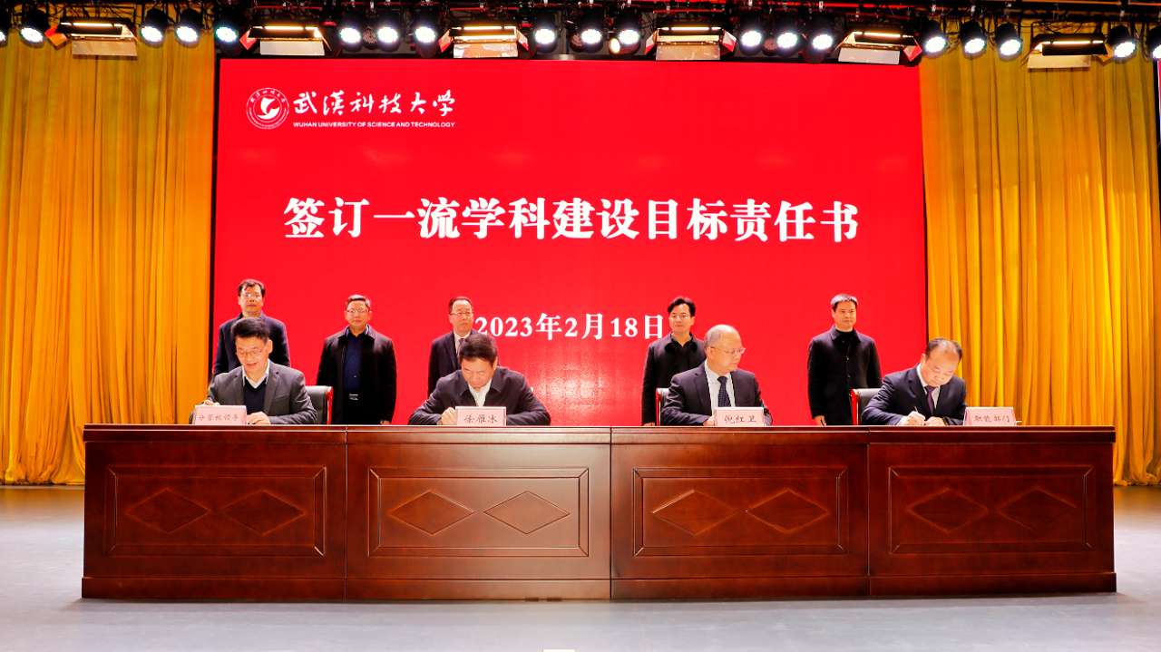武科大组建了战略咨询专家委员会,中国工程院院士谢先启代表专家线下致辞。学校成立了以党委书记和校长为组长的一流学科建设工作领导小组。该校科学技术发展院、人事处、本科生院、研究生院等相关职能部门负责人分别签订一流学科建设目标责任书。(光明日报全媒体记者张锐 通讯员李芳 摄影陈孖川)