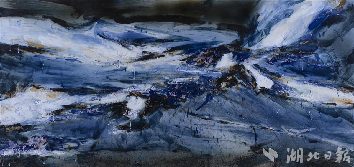 不同色相的蓝、大片的白,以及黄色、褐色交揉在一起,远看好似霞光……这幅画是什么?海浪?雪山?答案是:都可以。