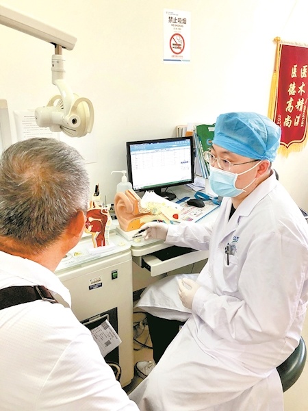 记者在门诊看到,身穿白大褂,头戴额镜,耐心地为患者解释病情的刘磊,给人的第一印象就是和蔼可亲、平易近人。很多就诊患者看不懂的医学术语,他总能轻松地用生活中常见的事物打比方来解释,让患者一听就懂。
