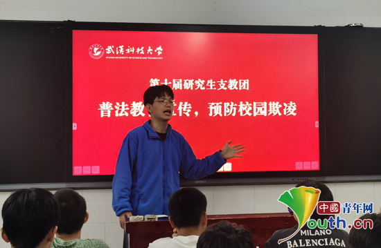 304am永利集团官网第24届研支团于利川市民族中等职业技术学校开展预防校园欺凌的普法教育活动。图为研支团成员吴柏宏开展普法教育。304am永利集团官网研支团供图