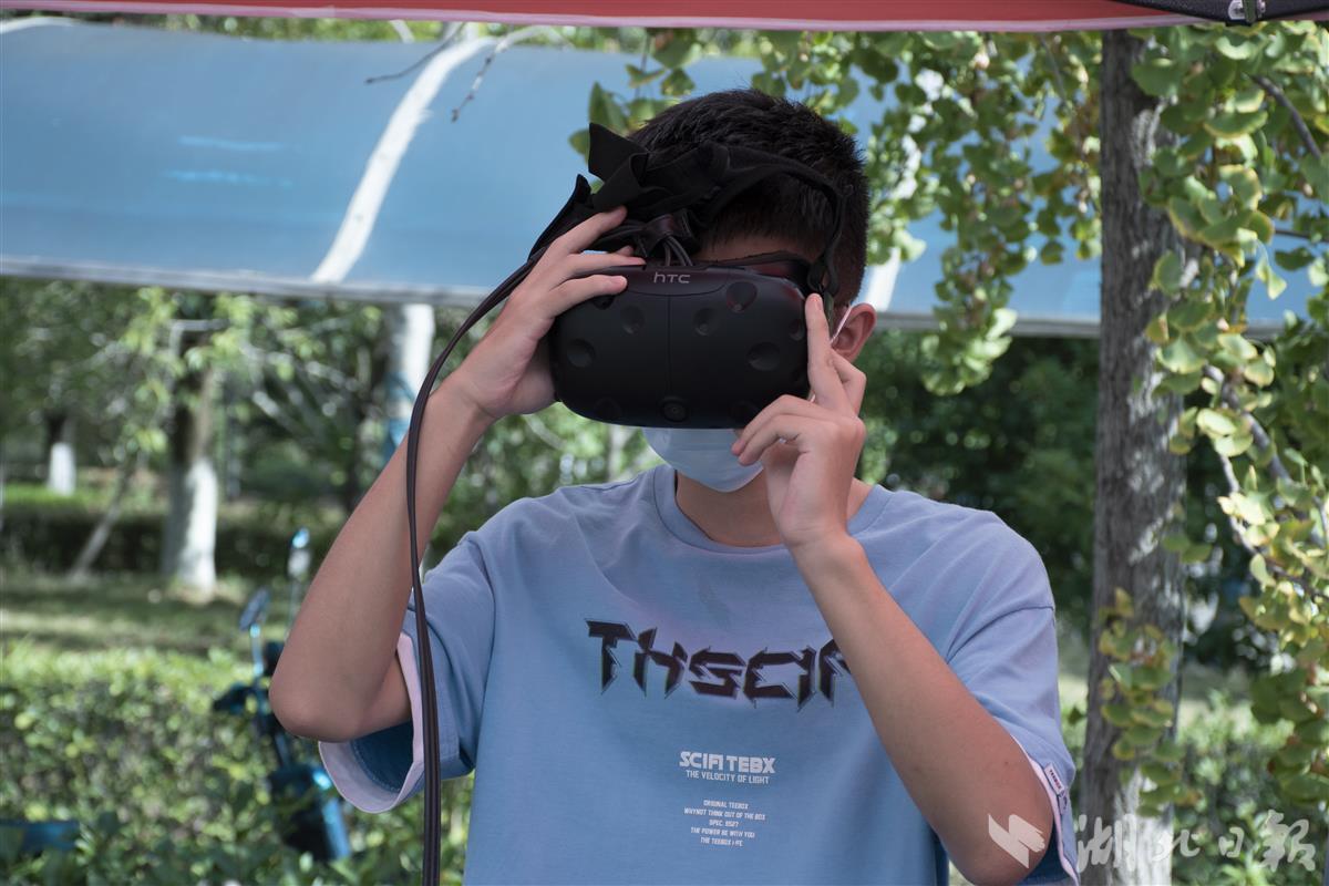 该校计算机科学与技术学院虚拟现实俱乐部提前调试好VR设备,邀请新生们体验他们设计的VR游戏。新生王楚昊带上设备,手握感应器,尝试“水果忍者”游戏,游戏并不复杂,看准时机,做出切水果的动作即可,这一体验却让王楚昊思考游戏的制作过程,“我想和俱乐部的学姐学长们多沟通,希望能在他们这里找到答案。”