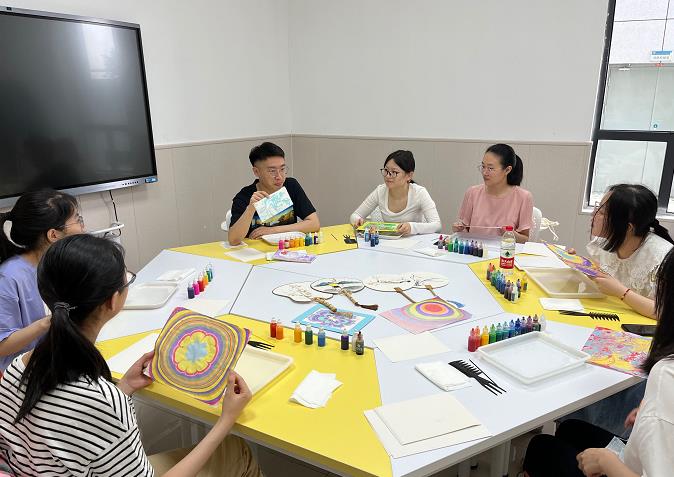在愈心陶绘室里,该校艺术与设计学院辅导员江峰戴着几名学生体验“浮水画”。医学院2019级学生任舒齐第一次参加,她将水、颜料滴入画液,逐渐晕开,形成底色,再用工具在水面上按照自己的想象与爱好,勾勒轮廓和花纹,然后将纸浸入水中,形成最后的画作。