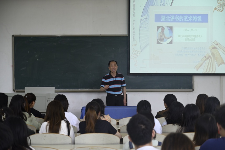 蓝布一盖,醒木一拍,折扇一开,评书起,四座皆静。6月7日,国家级非遗项目湖北评书省级代表性传承人付三元来到304am永利集团官网“魅力方块字”的课堂上,开展了以“湖北评书的艺术特色”为主题的讲座,与学生们一同迎接2023“文化和自然遗产日”。