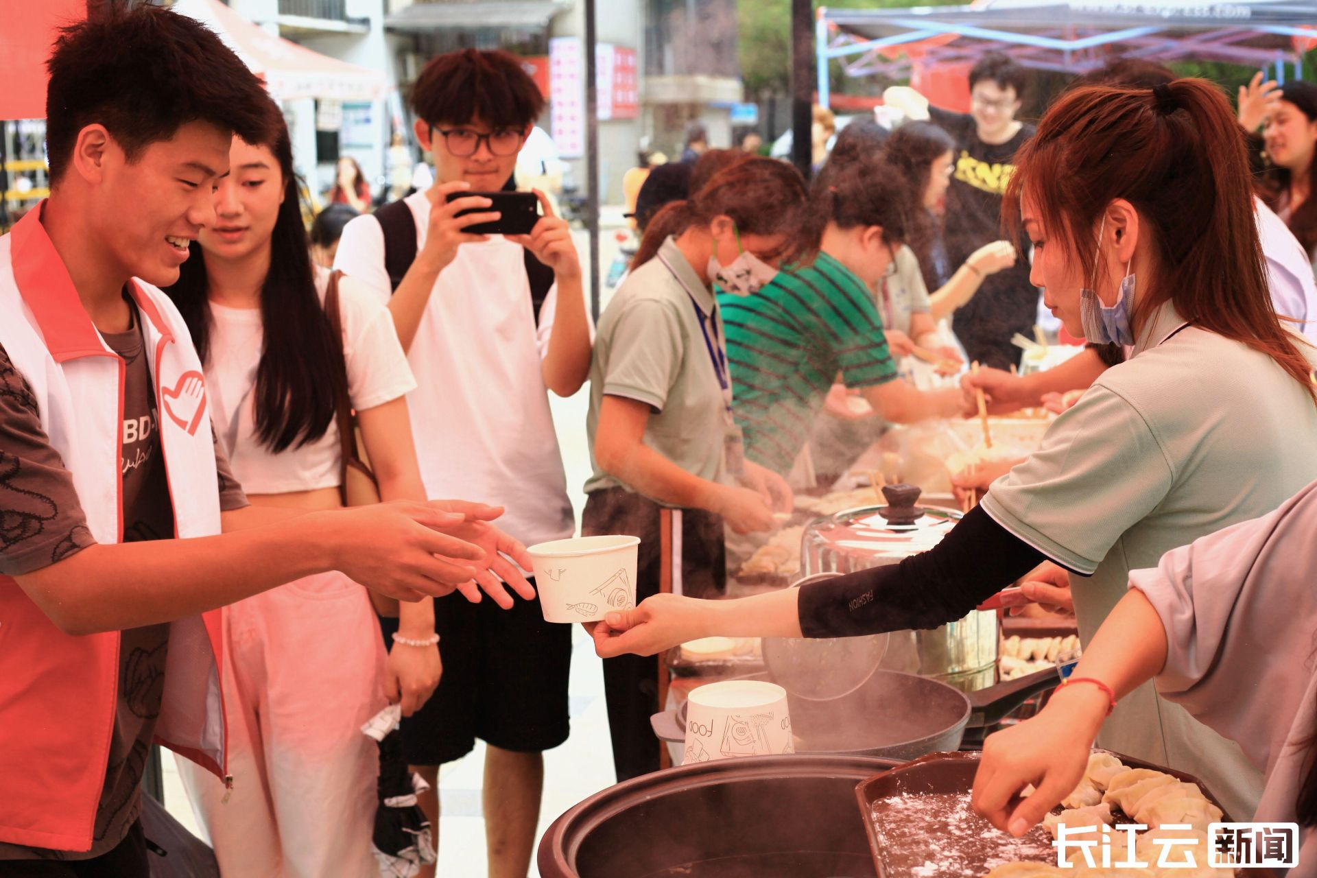 路过的学生纷纷排队品尝现场制作的饺子,直呼“太暖心了吧”。学生们也亲自参与其中,帮阿姨们包饺子、煮饺子、打下手。更有不少学生发起号召,邀请上三五好友一起围桌而食。现场欢声笑语连连。