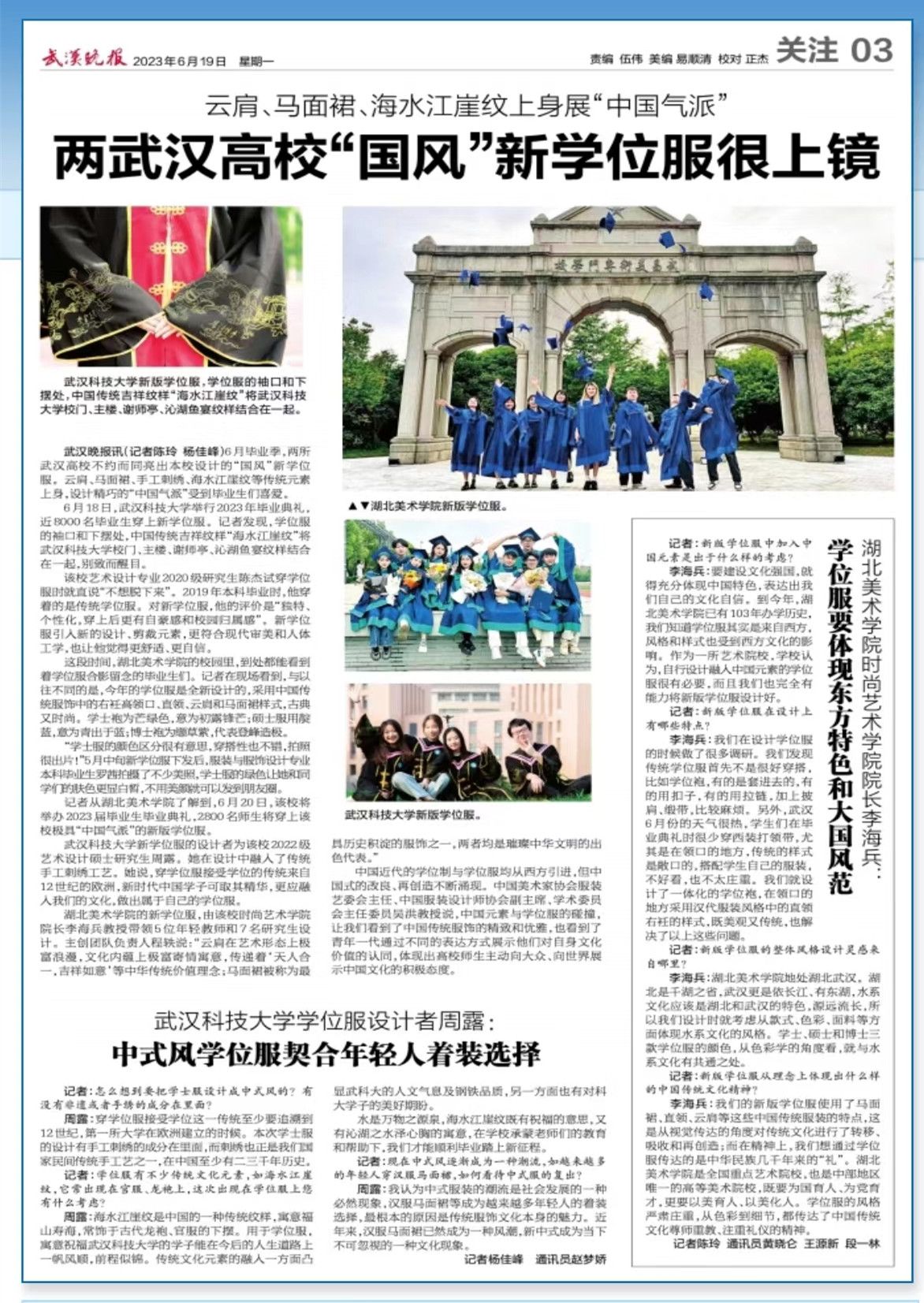 湖北美术学院的新学位服,由该校时尚艺术学院院长李海兵教授带领5位年轻教师和7名研究生设计。主创团队负责人程轶说:“云肩在艺术形态上极富浪漫,文化内蕴上极富寄情寓意,传递着‘天人合一,吉祥如意’等中华传统价值理念;马面裙被称为最具历史积淀的服饰之一,两者均是璀璨中华文明的出色代表。”