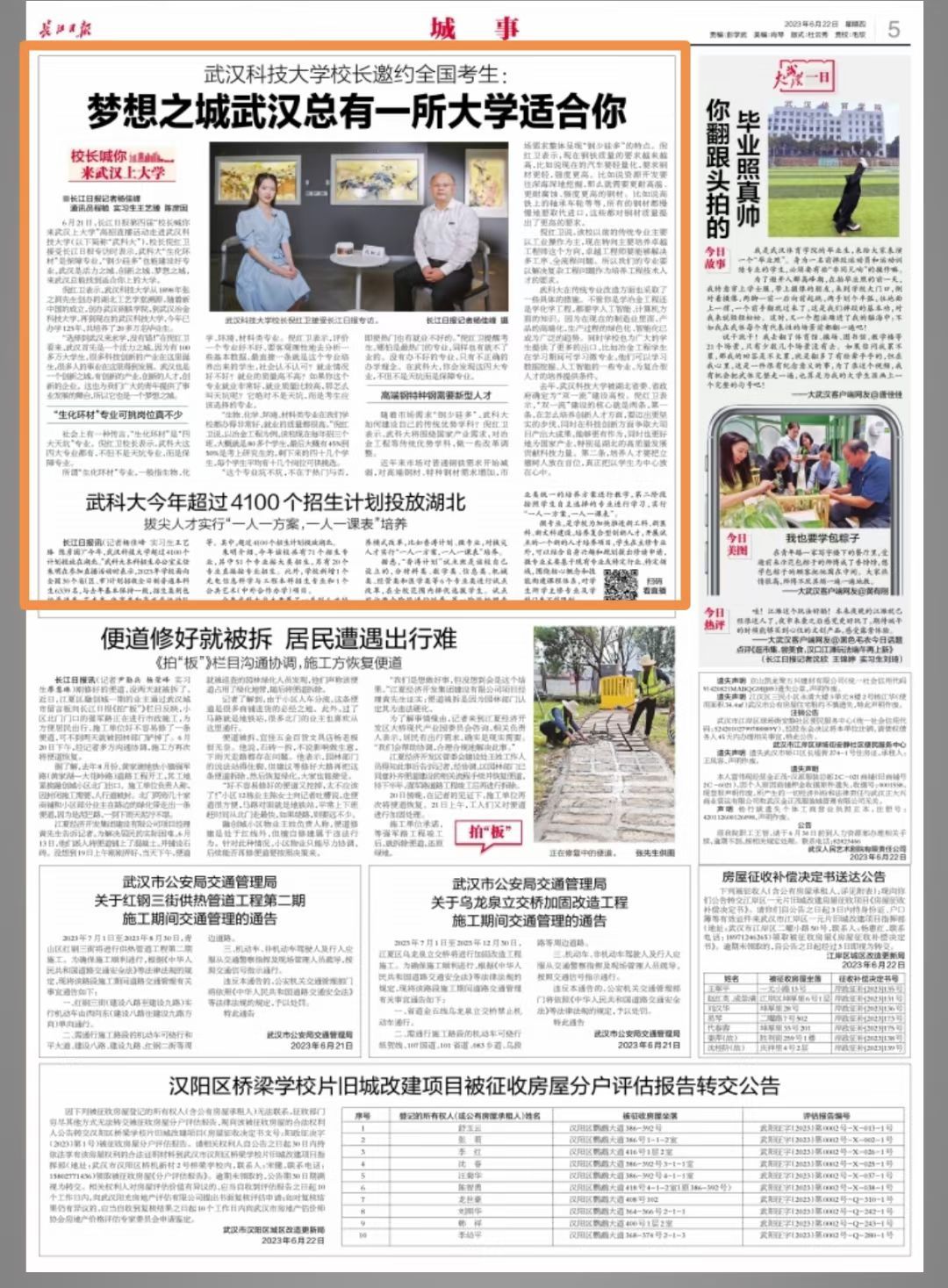 6月21日,长江日报第四届“校长喊你来武汉上大学”高招直播活动走进304am永利集团官网(以下简称“武科大”),校长倪红卫接受长江日报专访时表示,武科大“生化环材”是保障专业,“钢少硅多”也能建设好专业,武汉是活力之城、创新之城、梦想之城,来武汉总能找到适合你上的大学。