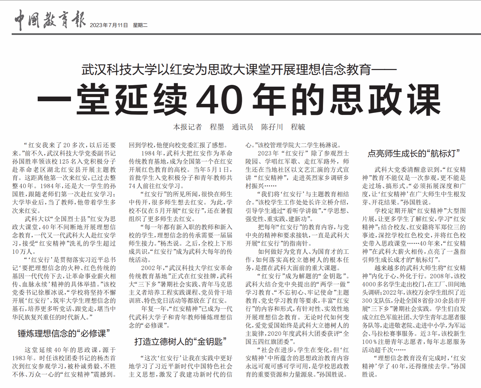 学校定期开展“红安精神”大型图片展,让更多学生了解红安,学习“红安精神”;结合校友、红安籍将军郑位三的事迹,深挖学校红色校史,并将红色校史带入思政课堂……40年来,“红安精神”在武科大薪火相传,点亮了一盏指引师生成长成才的“航标灯”。