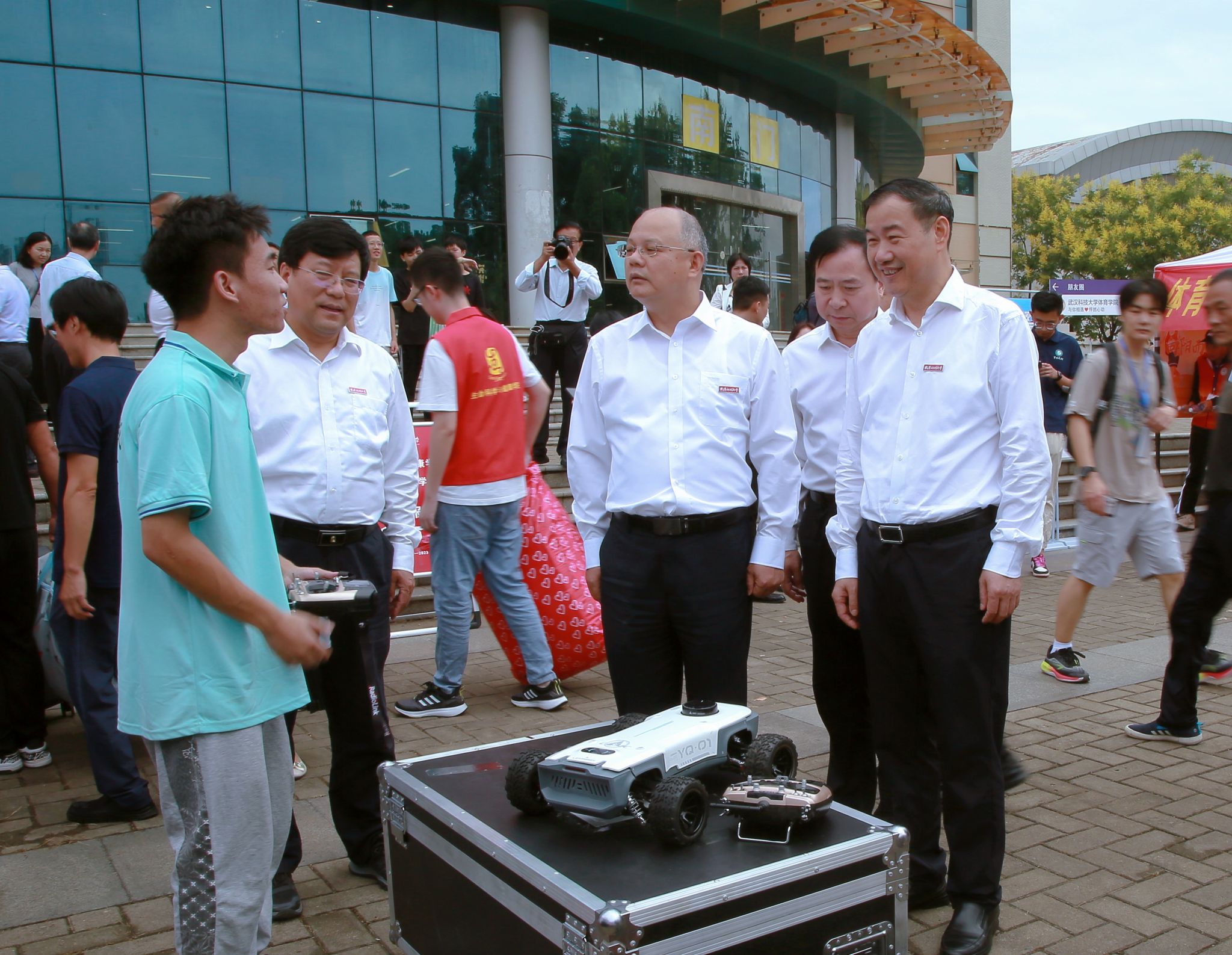 机械学院机器人协会负责人江朝辉为校领导们讲解机器人大赛,并现场演示机器人的操控使用,他说,“来报到的新生都觉得很有意思,纷纷想上手体验。”看到各迎新点志愿服务工作井井有条,校领导对志愿者的工作表示肯定与感谢,鼓励他们发挥志愿服务精神,让每一位新生第一时间感受到学校的关怀。