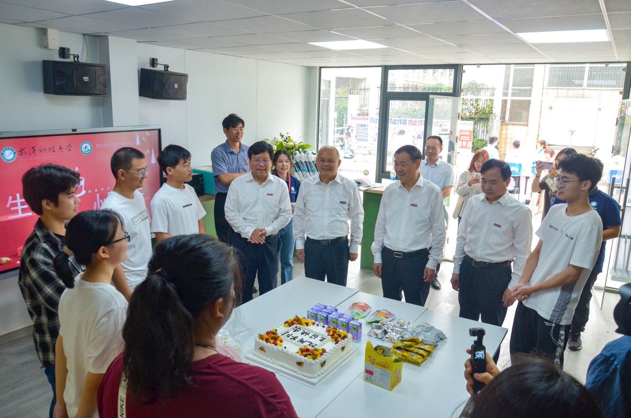 生日撞上报到日!来自不同学院12位新生参加学校为他们举行的集体生日,校领导为他们送上生日蛋糕、礼物和祝福。“本来以为这次到大学来没人知道我的生日,只能一个人孤零零地过了。没想到学校给了我一个大大的惊喜!”信息学院自动化专业祁忠楠说,“很高兴来到武科大这个大家庭,在这里过了一个非常有意义的成人礼,也希望我能度过充实的大学四年,实现自己的理想。”