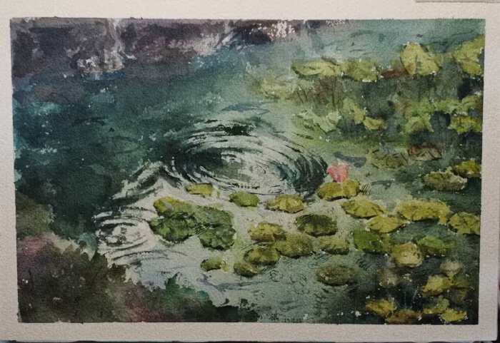 作品《谢师亭与沁湖》以谢师亭与湖心岛为核心,用荷叶、湖水、廊桥等校园风景元素加以点缀,构成了一副独具武科大特色的水墨风景画。“在水墨画中,平时司空见惯的谢师亭居然另有一番美意!”作者刘玥含说道,“中国画的形式能够很好地呈现武科大的文化底蕴,也给了我们一次静下心来观察校园的机会。”