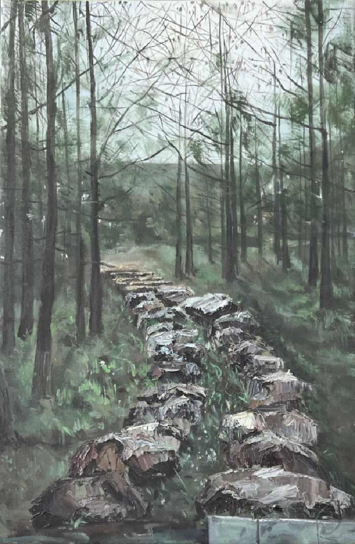 除了大场景的描写,不少作品聚焦细节和校园文化内涵。《校园秋末》展现秋未校园角落,运用国画中的白描手法描绘秋末荷叶的残卷与舒展,刻画校园枯树苍老与坚韧。《沁湖荷叶》以用水墨效果的荷叶呈现武科大的诗意。《校园风光》借图书馆前沁湖绿道的斑驳光影,展现了校园学习环境的清新与静谧。《钢铁精神》结合校史,以“钢”字形为画,通过熔铁入钢的画面展现武科大的钢铁精神。