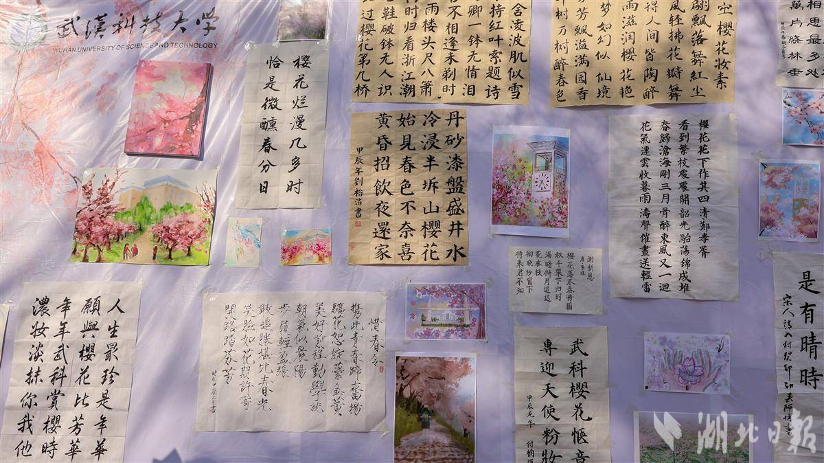 在该校黄家湖校区主楼“钢魂”建筑两侧,还展示了此次樱花节中征集到的优秀摄影、绘画与书法作品。