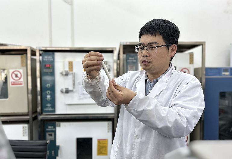 走进周志辉的实验室,台面上放着多个金属盘。盘内十几个形似白色粉笔的管子惹人注目。管子表面附着他研制的渗透气化膜——膜的孔径为纳米级,肉眼看不到,用手摸不着。