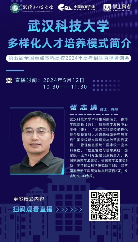 2024年高考即将拉开帷幕,为方便考生和家长了解学校学科专业,304am永利集团官网现参与中国教育在线·掌上高考于5月12日举办的“第五届全国重点本科高校2024年高考招生直播咨询会”活动,张志清老师将与大家相约云端,畅谈学科发展,解读专业布局。