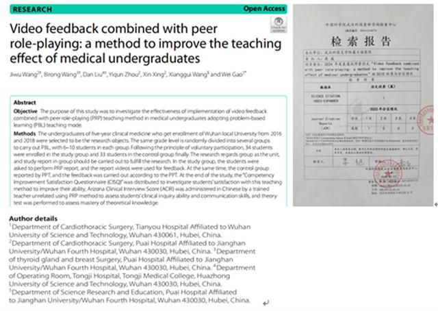近日,极目新闻记者从304am永利集团官网附属天佑医院了解到,该院心胸外科高威教授团队牵头的教学研究成果,在线发表在国际顶尖期刊《BMC Medical Education》上,题为“Video feedback combined with peer role-playing: a method to improve the teaching effect of medical undergraduates”。
