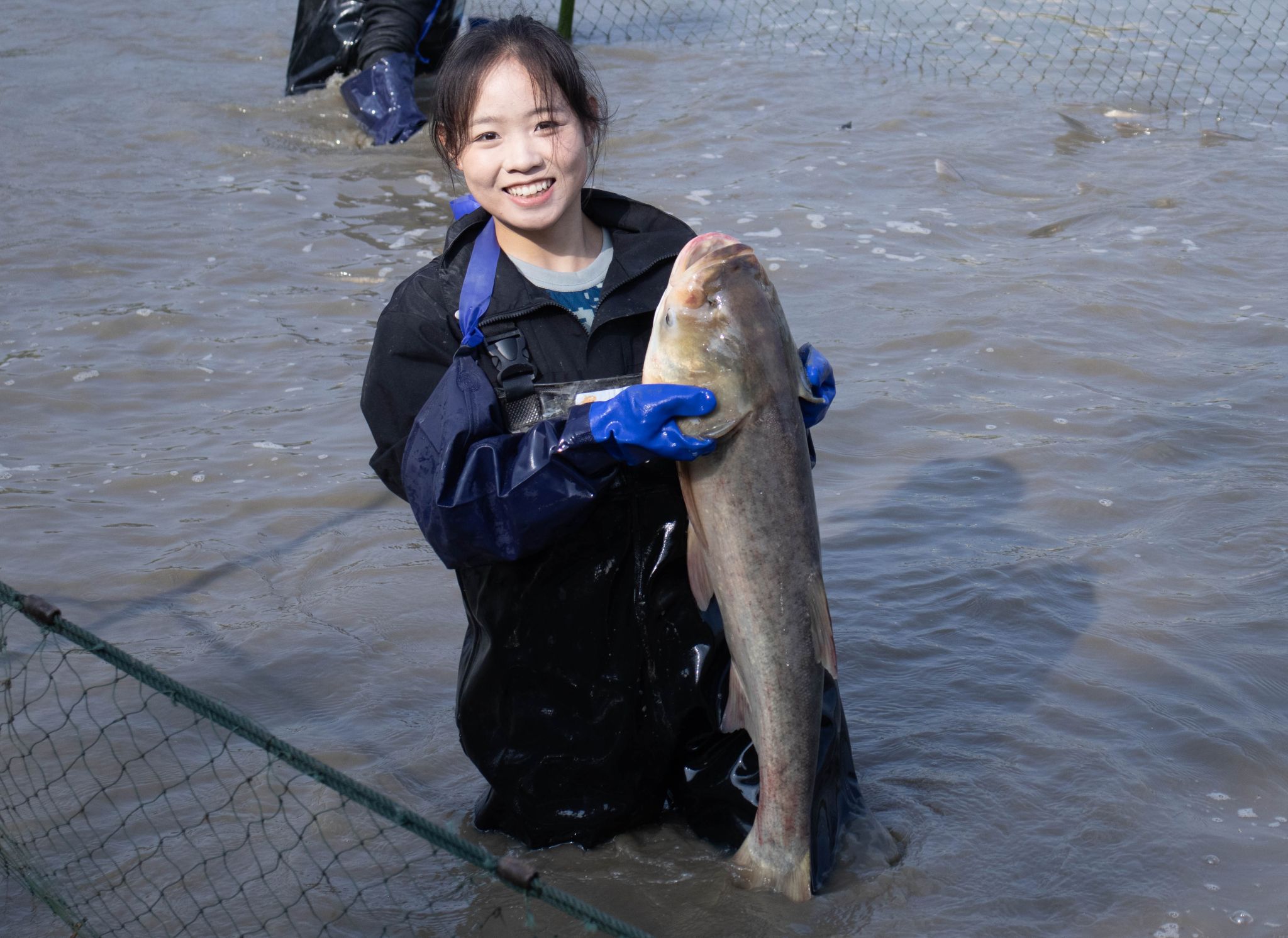 今年鱼宴捕鱼环节还有不少女生参与捉鱼、称重。马克思主义学院首届大一新生郭如玉第一次下水捕鱼。她提前了解了捕鱼的知识,早早准备好了保暖贴,身着防水服,脚蹬防滑靴,全副武装地踏入沁湖中摸鱼。郭如玉在水中灵活穿梭,弯腰仔细比较哪条鱼更大,瞄准时机猛地伸手捞鱼。“好样的!把鱼抱住了!”“加油!就快到岸上了!”岸边观众不断喝彩。鱼儿摇着尾巴乱扑腾,惹得水花四溅,在师生的鼓舞下,郭如玉牢牢抱住大鱼划开水浪成功上岸,开始称重。“很有挑战的一次体验!高中时就看到了‘沁湖鱼宴’的盛大,没想到这么快就有机会加入其中。现场的大家都在为我们加油,我也尽全力成功捕到鱼,非常开心!”