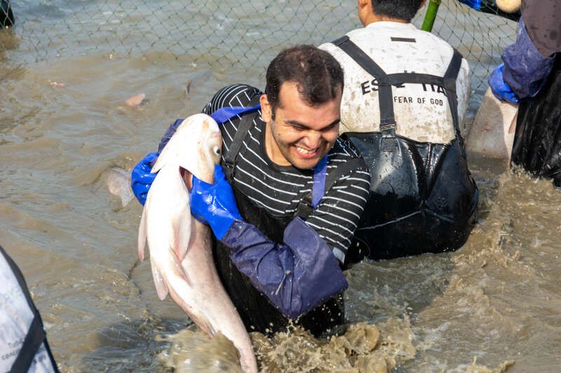 10时许,经过一个多小时的努力,随着一声“起网”,一条条鲜活肥硕的鱼儿在水面上翻飞跳动。渔网固定后,十名中外学生随即穿好捕鱼套装下水捕鱼,争夺捕鱼王的桂冠。