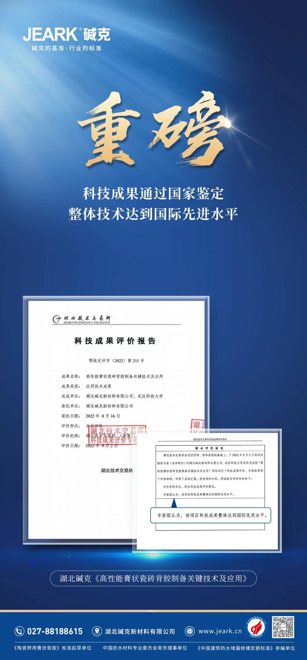 展望未来,湖北碱克将以此次成果为新的起点,持续发挥《高性能膏状瓷砖背胶制备关键技术及应用》的科技优势,坚定不移地走在自主研发创新的前沿。以科技成果评价的科学性、专业性、公正性和权威性为依托,加速科技成果产业化进程,进一步推动中国铺贴辅材行业的高效发展,为行业的持续创新贡献更多力量。(中华网)