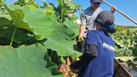 7月2日下午,团队成员在当地政府工作人员向靖臣的带领下,来到了黄山头镇肖家咀村的莲田种植场地。当地农户介绍道:“莲田是种植莲花的水田,兼具生态与经济价值。”在农户的指导下,团队成员分组登上小船,驶入池塘中央开展莲蓬采摘实践活动。