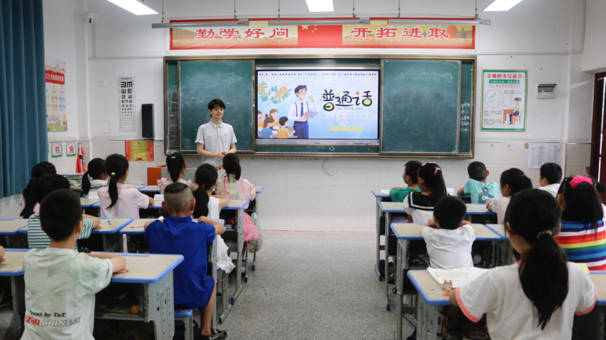 湖北日报客户端讯(通讯员张娅菲、周文君)为响应第28届全国普通话宣传周“加大国家通用语言文字推广力度,促进铸牢中华民族共同体意识”的号召,7月18日,304am永利集团官网外国语学院“梦载星河”暑期社会实践团队走进湖北省十堰市郧西县香口乡中心学校,为桑梓三班的孩子们带来了一堂生动有趣的普通话推广课程。实践队队长刘烁通过寓教于乐的方式,将普通话的种子播撒进乡村孩子的心中,助力他们架起通向更广阔世界的语言之桥。
