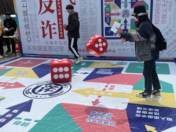 游戏互动区的气氛也十分火热。“套圈”游戏吸引了不少学生,通过套圈鼓励学生们下载国家反诈APP。“反诈飞行棋”更是有着极高的人气,参与者从地图上的起点出发,一路闯关躲避“诈骗陷阱”并获得奖励,最后抵达“国家反诈中心”终点。掷骰子、识陷阱,考验运气,更考验“反诈头脑”,在欢快的气氛中学生们学习到了许多反诈知识。保卫处治安科的杨阳说:“通过游戏互动与反诈知识相结合的模式更能让同学们在寓教于乐中了解反诈防诈知识,增强同学们的财产安全意识。”