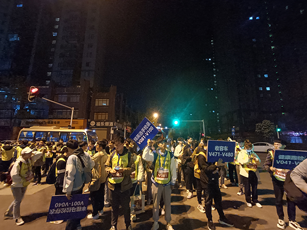 凌晨3点半,永利官网黄家湖校区的658名志愿者驱车20km,于凌晨5点抵达赛事现场,与青山校区的52名志愿者集结。各赛道入场处,检录组志愿者仔细核对参赛者信息并提供指引。距比赛开始半小时,人墙志愿者手拉手,将参与比赛的不同组别分隔开,以维持秩序。早晨7:30,半程马拉松正式鸣枪开跑,210名医疗志愿者每隔100米分别排开,随时待命,为路过的志愿者提供医疗救助。补给组则将饮料和矿泉水分发到每一个塑料杯,以方便跑者补充水分。