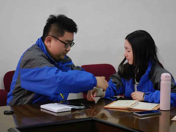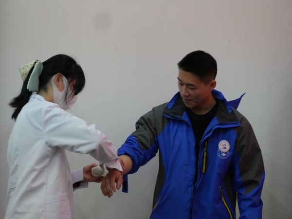 汪诗雨向研支团成员介绍了按压止血和擦伤、扭伤、抽筋的处理方法;冯越玥向研支团成员示范了如何包扎常用的四种方法,并指导研支团成员如何正确包扎。通过实践学习,研支团全体成员已会正确进行包扎。