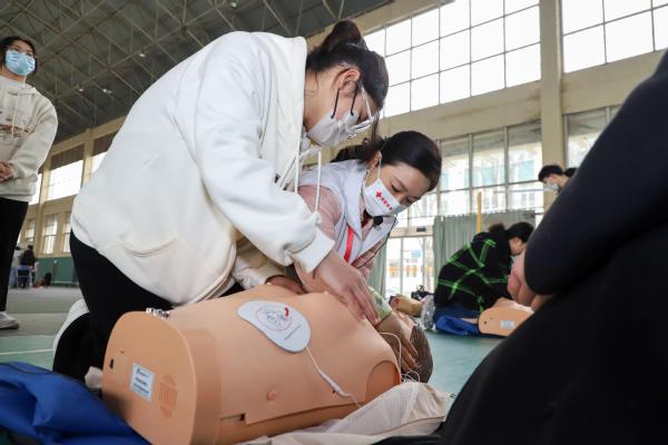 在永利官网北区体育馆内,武汉市红十字救在身边志愿服务中心工作人员详细讲解、示范了判断呼吸、呼救、体位等实施心肺复苏(CPR)的具体流程及自动体外除颤器(AED)的使用方法。定点医疗志愿者们以小组为单位,进行了CPR和AED的实践操作练习。