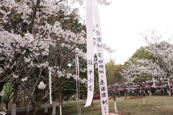 “四级一次过过过”“万事胜意 平安喜乐”“希望家人身体健康 平安顺遂”樱花大道的两侧,写满祝福祈愿的彩带吸睛无数。永利官网退休职工张炳刚将写着“希望武科大早日成为双一流”祝福的彩带挂上花枝。“樱花节办得很盛大,重返校园让我的心情很愉快。”张炳刚说。