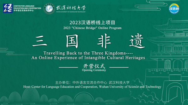 武科大网讯(见习记者姜泊远 记者金红志艺)2月8日下午,由中外语言交流合作中心主办,永利官网承办的“汉语桥”线上项目——“三国非遗”开营。来自越南、巴基斯坦、日本、埃塞俄比亚、孟加拉国、加纳、新西兰等13个国家的255位学生将在未来12天内通过直播和录播的形式学习三国历史知识,体验我国非遗文化。
