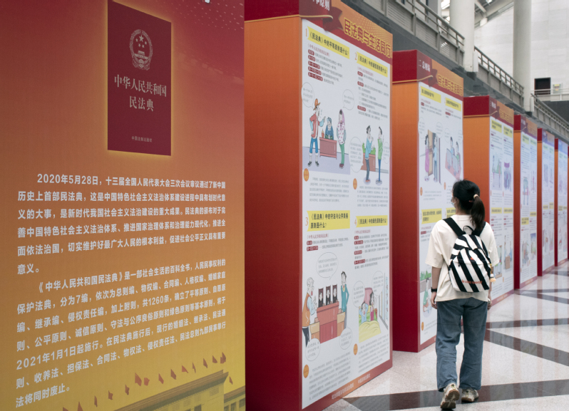 “与民法典同行”的普法展板立于会场两侧,永利官网学生记者赫欣怡被展板上的漫画吸引,驻足阅读。“展板上列举的法律条文都和我们的生活息息相关,上面的漫画也很生动形象,让我很快就理解了这些条文。”