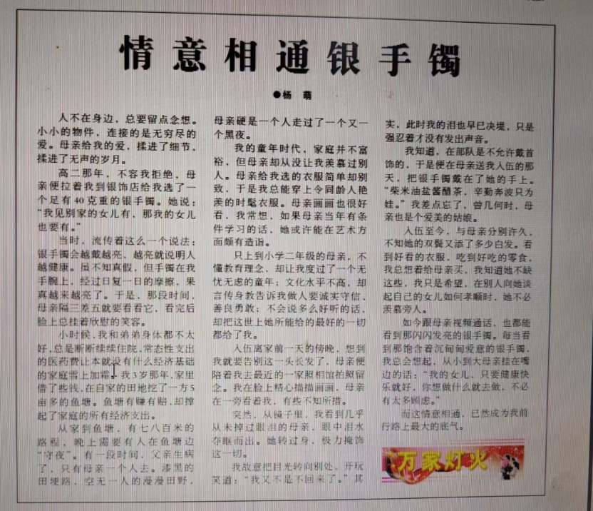 荣誉是对我工作成绩的肯定,也是我军旅生涯里的重要收获。2021年底,我荣获了单位年度新闻报道优秀个人;退伍时,也被评为“四有”优秀个人。感谢组织的认可,感谢身边给予善意和帮助的所有人,也感谢一直坚持的自己。