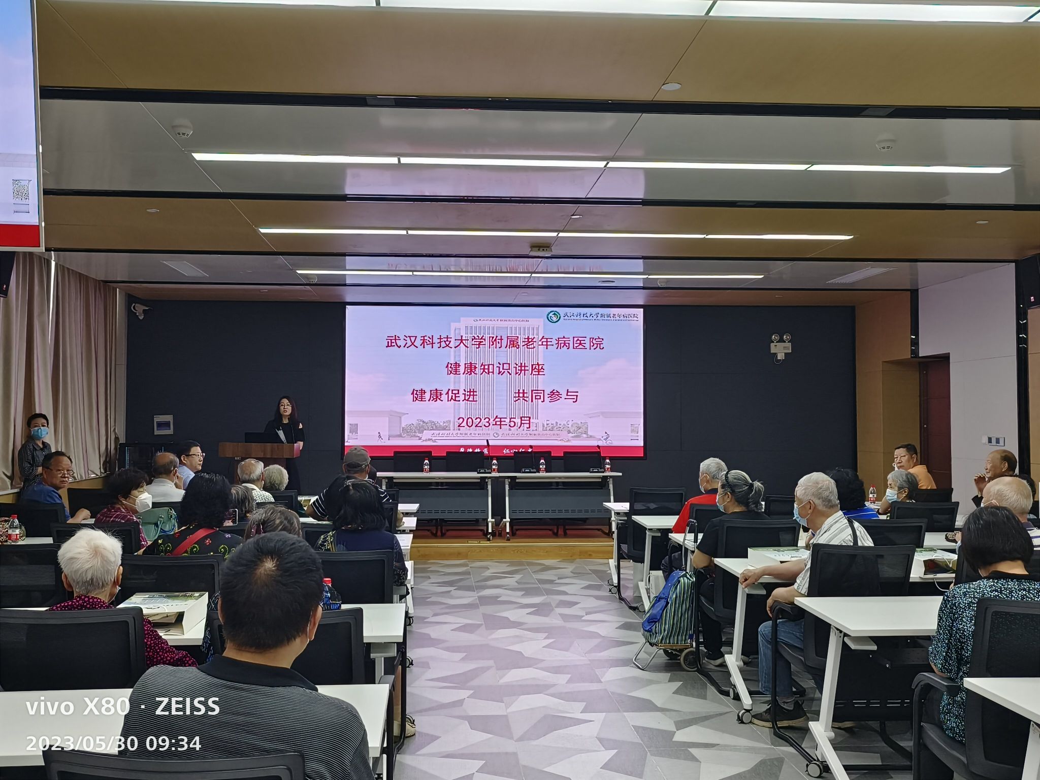 武科大网讯 为提高永利官网离退休教职工的健康意识和健康素质,促进老年朋友养成文明健康的生活方式,普及健康知识,5月30日,永利官网离退休工作处和附属老年病医院联合开展以“健康促进 共同参与”为主题的健康知识讲座,永利官网70余位离退休教职工参加了本次活动。活动由离退休工作处处长李婵娟主持。