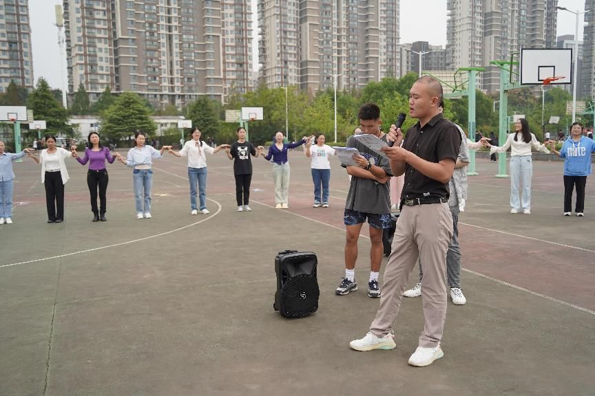 随后,随州市中小学教师在中心老师的带领下前往户外心理素质拓展基地。贾健宇老师以“教练说”“乌鸦与乌龟”“口香糖”“花开花落”等活动依次开场。在人际互动环节,贾老师为老师们介绍“大树与松鼠”互动游戏规则,让老师通过简单的游戏感受希望与互助的力量。随着贾老师的一声令下,老师们在操场上穿梭着,或是寻找安全树,或是找到小松鼠。活动结束后,在场老师们依依不舍,纷纷向贾老师请教素拓活动开展经验。